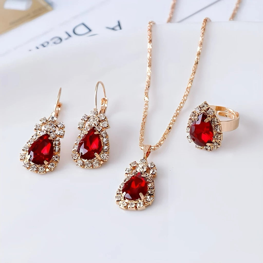 O Conjunto de Joias Gotinha VALLARE inclui colar, brincos e anel com strass coloridos, ideal para noivas ou ocasiões especiais. Com design feminino e vintage, cada peça valoriza o visual com elegância, sendo um presente perfeito ou um toque de luxo para o seu look.